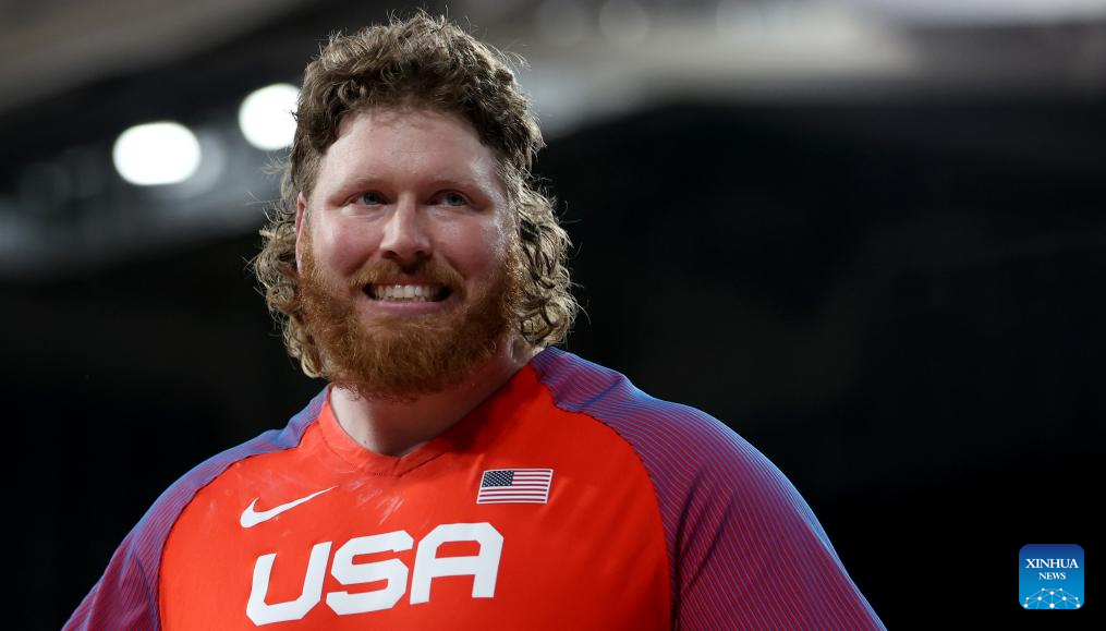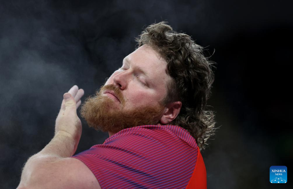 Ryan Crouser of the United States reacts during the men's shot put final of the 2024 World Athletics Indoor Championships in Glasgow, Britain, March 1, 2024. (Xinhua/Li Ying)