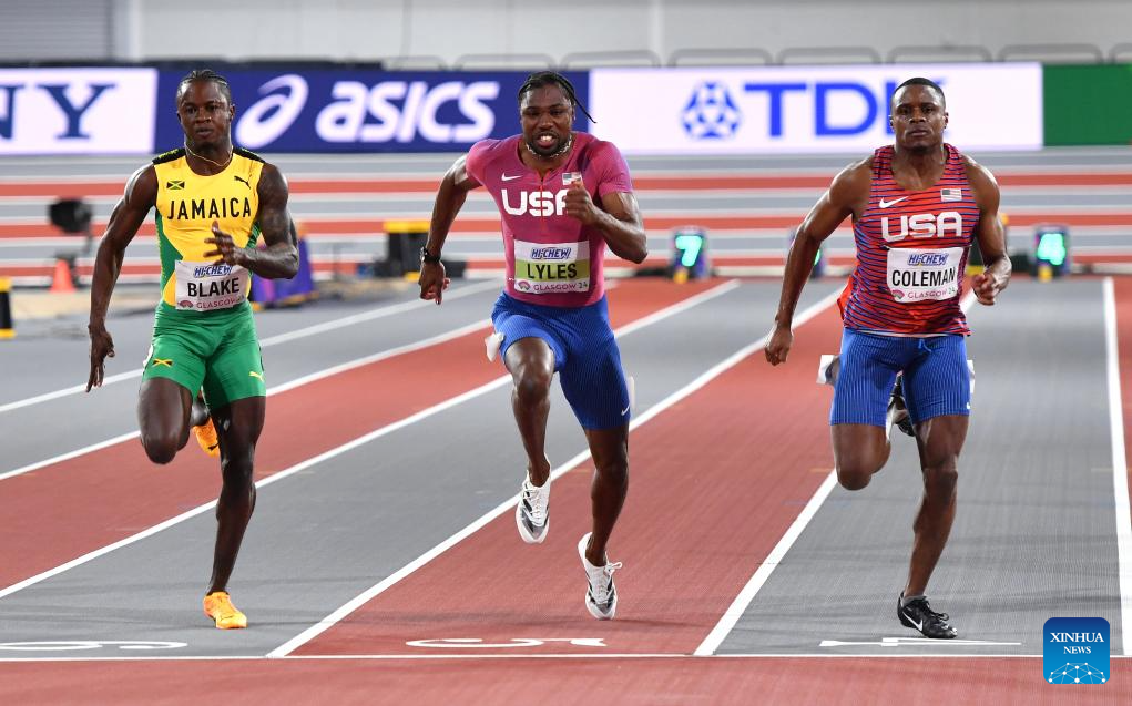 Christian Coleman (R), Noah Lyles (C) of the United States and Ackeem Blake of Jamaica compete during the men's 60m final of the 2024 World Athletics Indoor Championships in Glasgow, Britain, March 1, 2024. (Photo by Mark Runnacles/Xinhua)