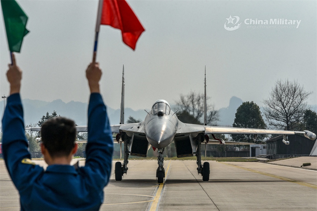 A ground crew member assigned to an aviation brigade of the air force signals a pilot to taxi on the runway after a flight training exercise on February 20, 2024. (eng.chinamil.com.cn/Photo by Fu Gan)