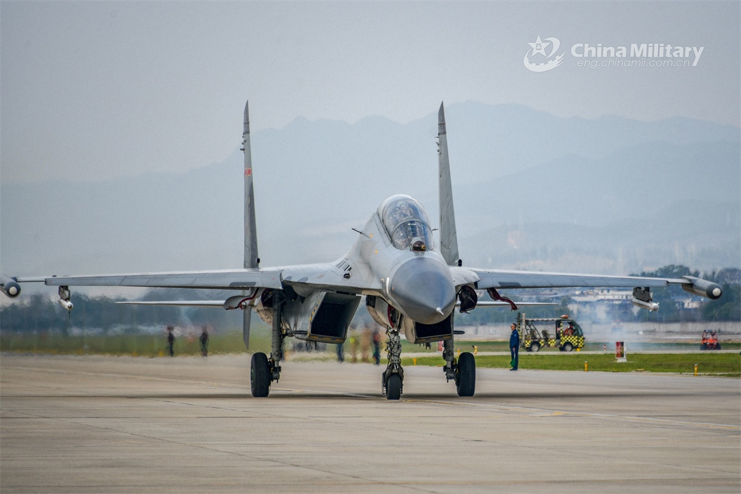 Fighter jet attached to an aviation brigade of the air force taxis on the flightline before takeoff for a flight training exercise on February 20, 2024. (eng.chinamil.com.cn/Photo by Fu Gan)