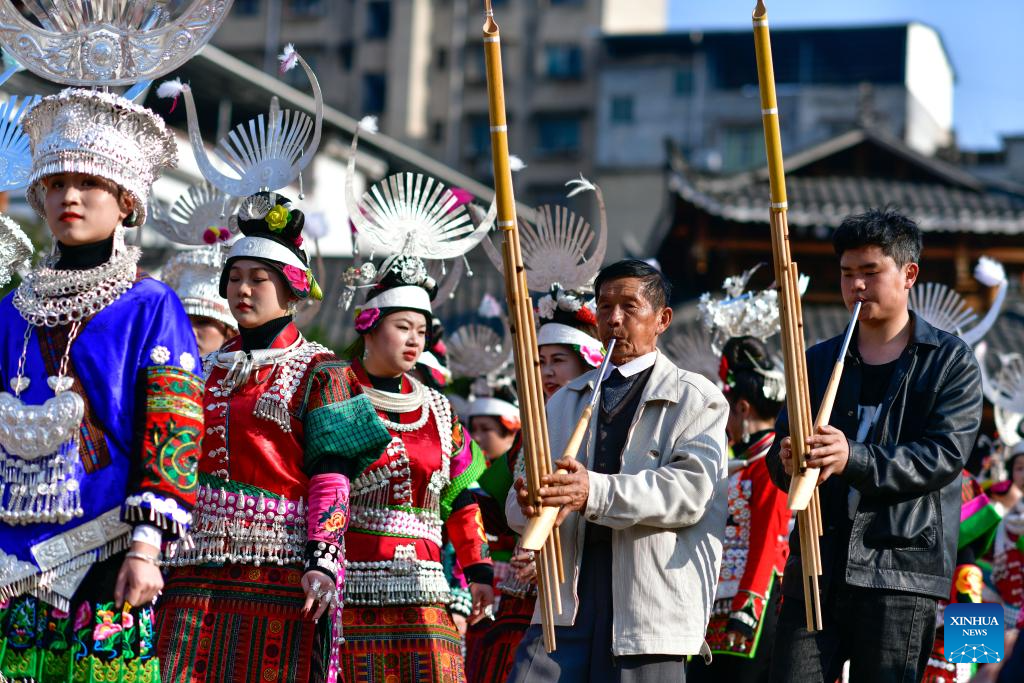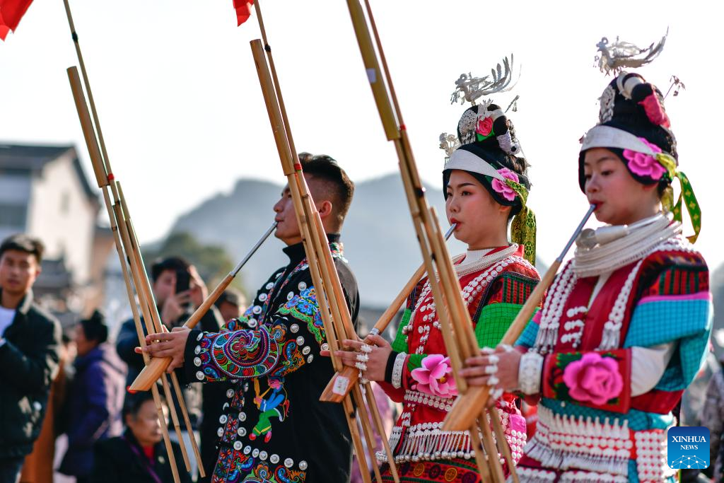 People of Miao ethnic group perform Lusheng, a traditional musical instrument, in celebration of the Gannangxiang festival in Kaili, Qiandongnan Miao and Dong Autonomous Prefecture, southwest China's Guizhou Province, March 2, 2024.?(Xinhua/Yang Wenbin)