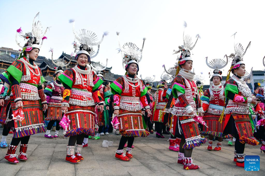 Girls of Miao ethnic group perform a dance in celebration of the Gannangxiang festival in Kaili, Qiandongnan Miao and Dong Autonomous Prefecture, southwest China's Guizhou Province, March 2, 2024. (Xinhua/Yang Wenbin)