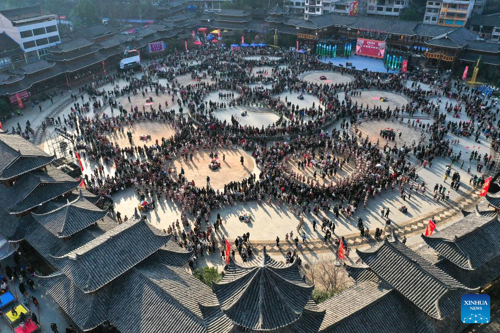 An aerial drone photo taken on March 2, 2024 shows people of Miao ethnic group celebrating the Gannangxiang festival, in Kaili, Qiandongnan Miao and Dong Autonomous Prefecture, southwest China's Guizhou Province.?(Xinhua/Yang Wenbin)