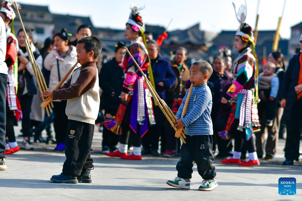Children perform Lusheng, a traditional musical instrument, in celebration of the Gannangxiang festival in Kaili, Qiandongnan Miao and Dong Autonomous Prefecture, southwest China's Guizhou Province, March 2, 2024.?(Xinhua/Yang Wenbin)