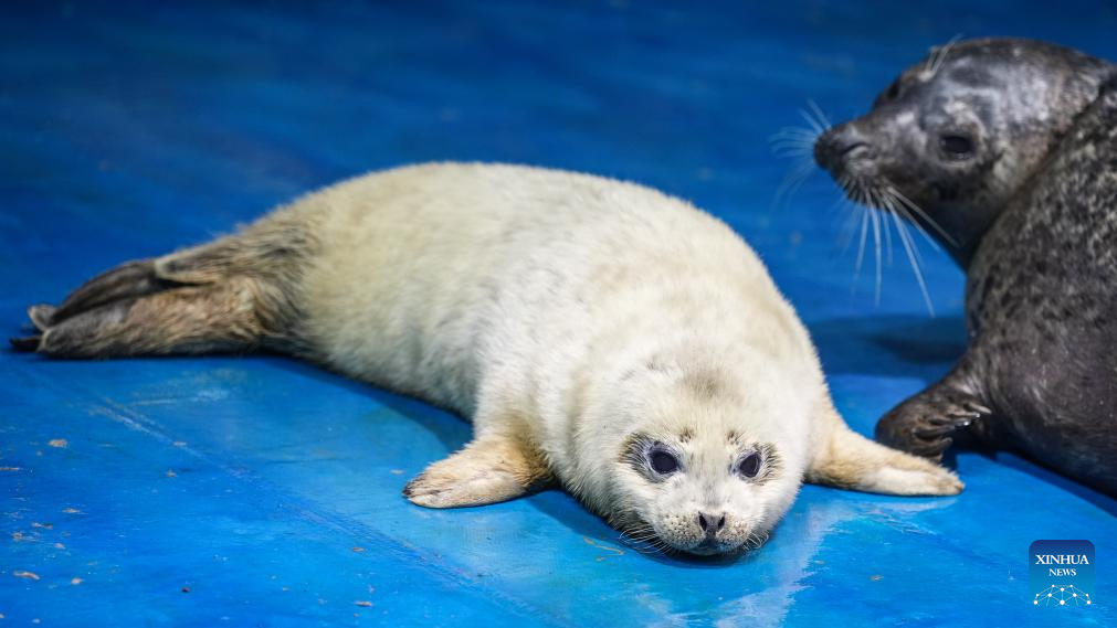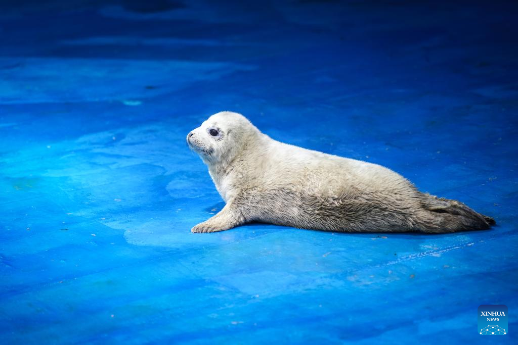 This photo taken on Feb. 28, 2024 shows a spotted seal pup born in 2024 at Dalian Sunasia seal breeding base in Dalian, northeast China's Liaoning Province. (Xinhua/Pan Yulong)