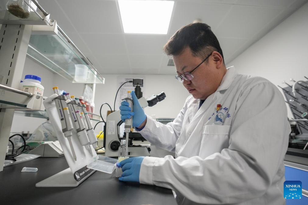 Dr. Luo Jun tests sea water samples at Dalian Sunasia Marine Biology Institute in Dalian, northeast China's Liaoning Province, Feb. 28, 2024. (Xinhua/Pan Yulong)