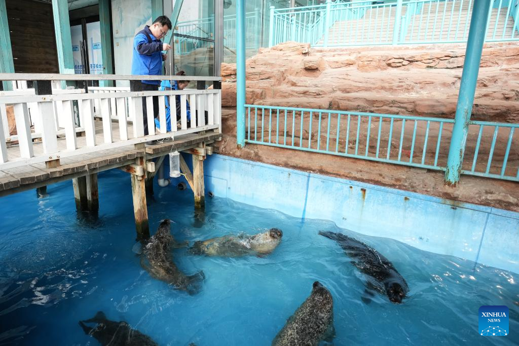 Dr. Luo Jun prepares food for spotted seals at Dalian Sunasia Marine Biology Institute in Dalian, northeast China's Liaoning Province, Feb. 28, 2024. (Xinhua/Pan Yulong)