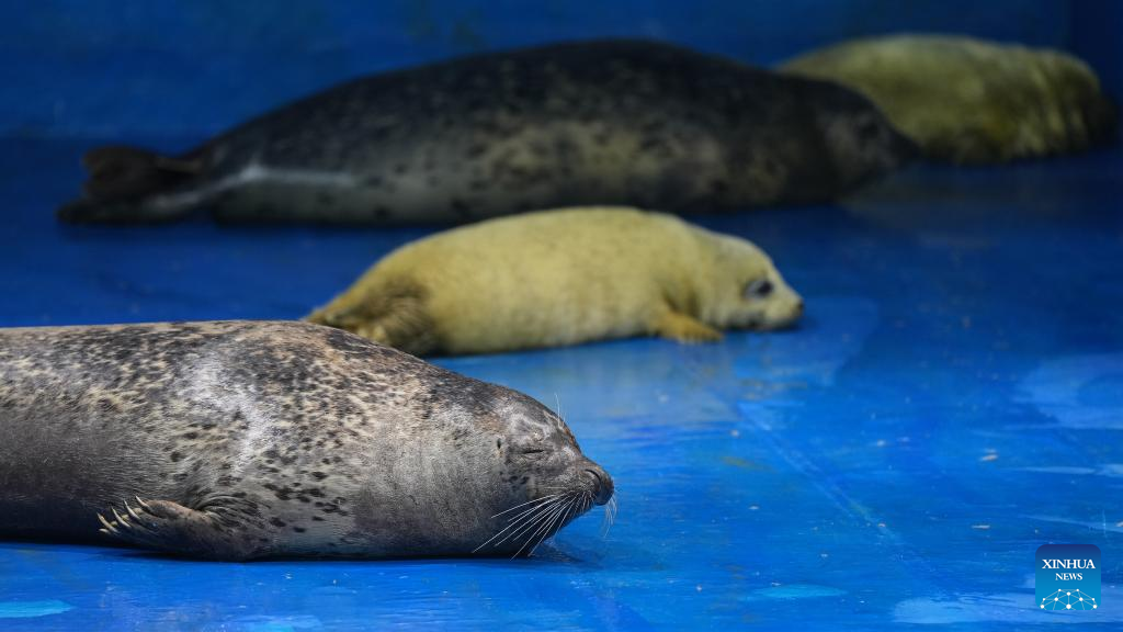This photo taken on Feb. 28, 2024 shows spotted seals at Dalian Sunasia seal breeding base in Dalian, northeast China's Liaoning Province. (Xinhua/Pan Yulong)