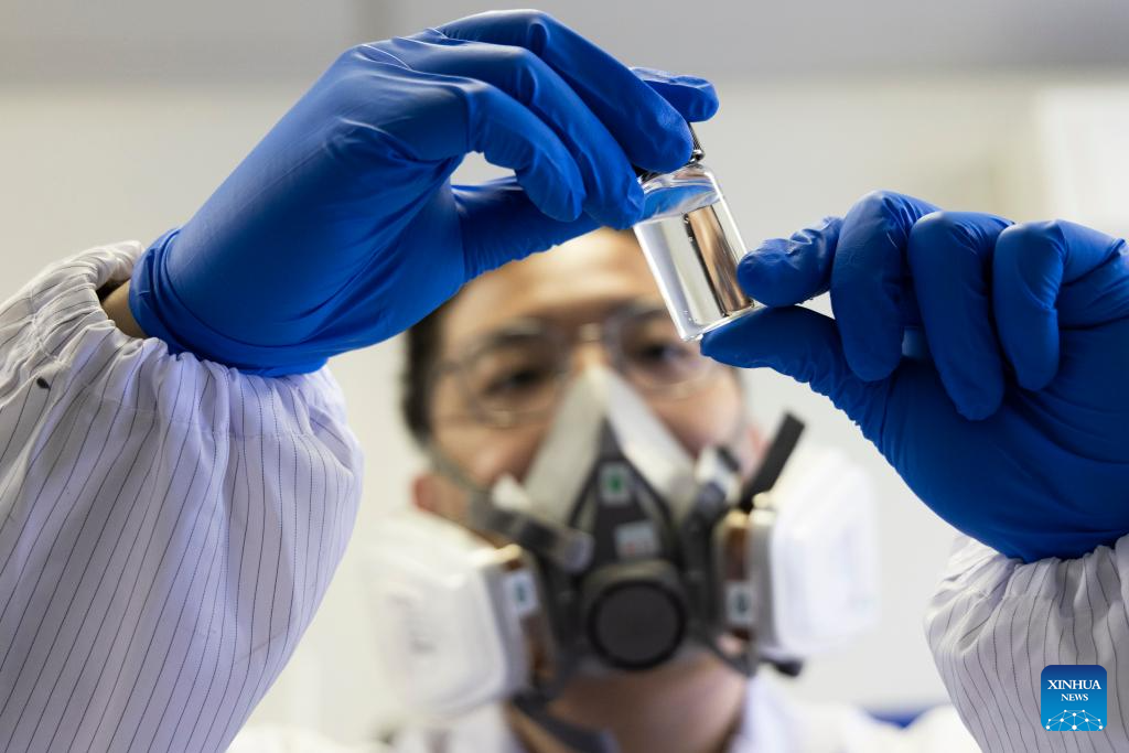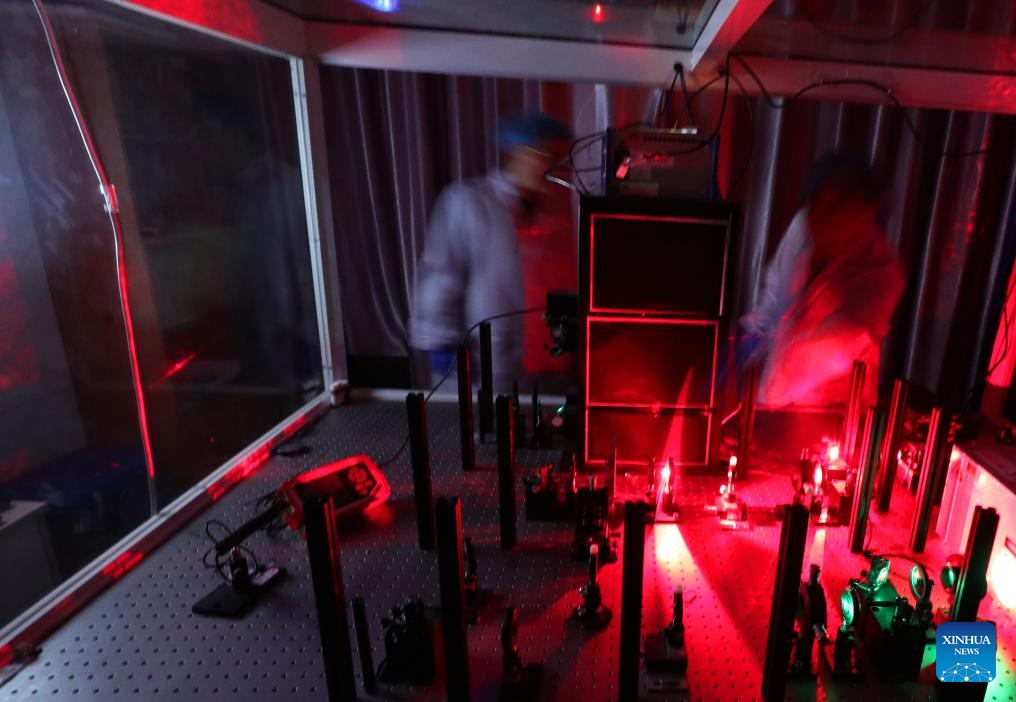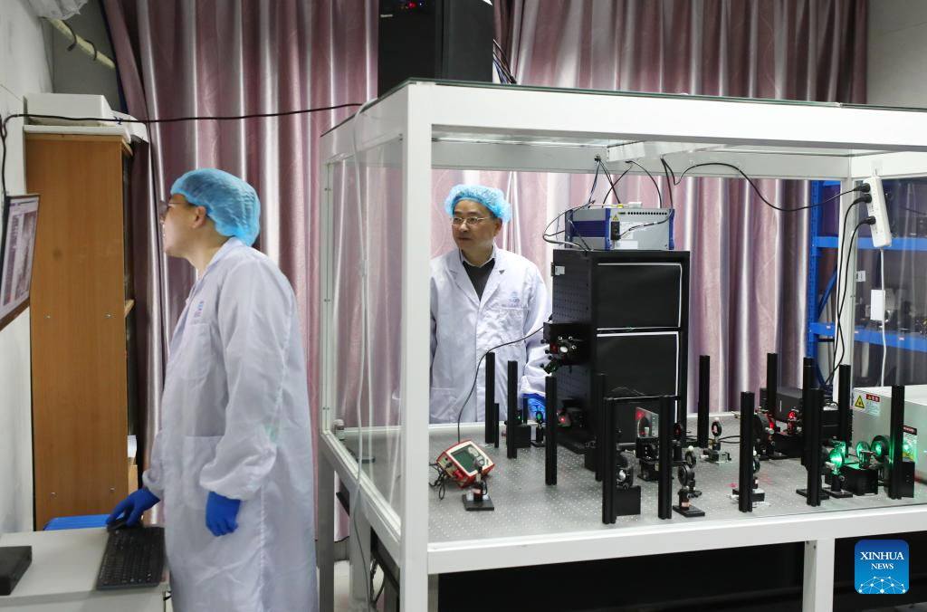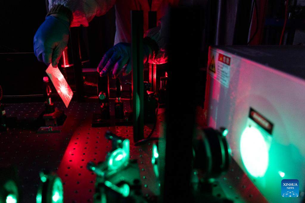 Researchers perform an experiment at a laboratory in the Shanghai Institute of Optics and Fine Mechanics, Chinese Academy of Sciences in east China's Shanghai, Feb. 29, 2024. (Xinhua/Fang Zhe)