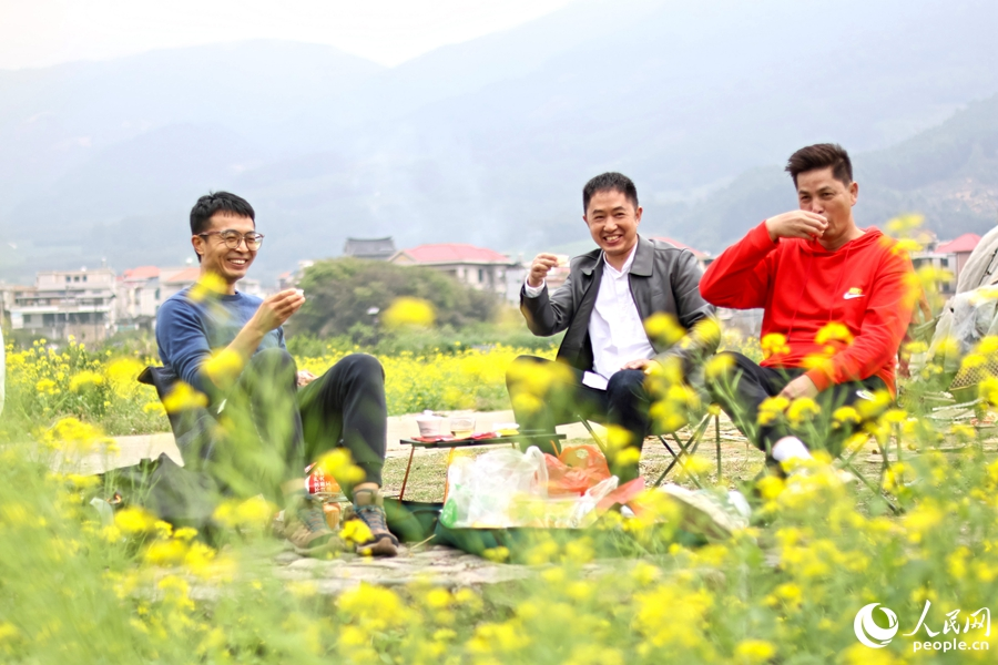Tourists drink tea at a rapeseed field in Shanchong village, Changtai district, Zhangzhou city, southeast China's Fujian Province. (People's Daily Online/Li Changqian)