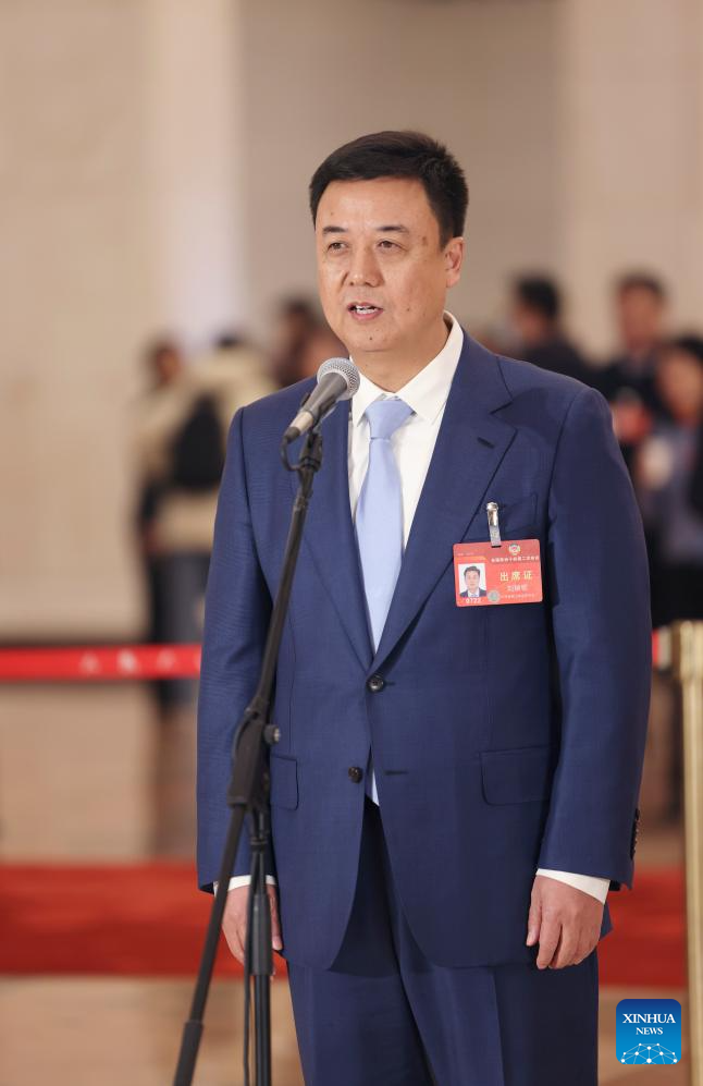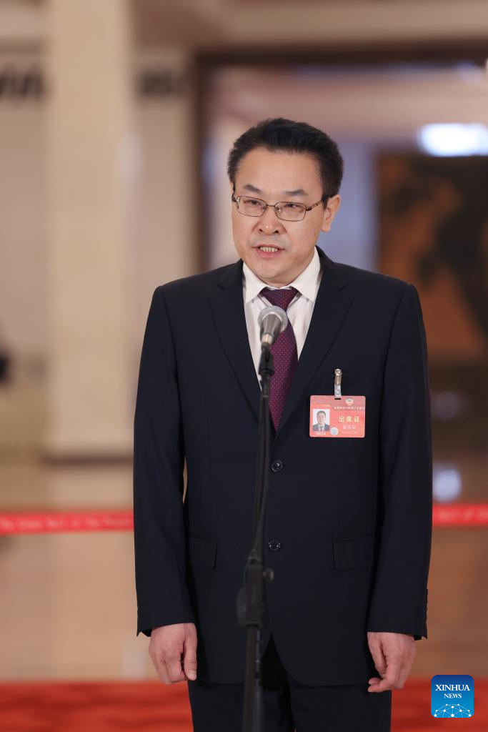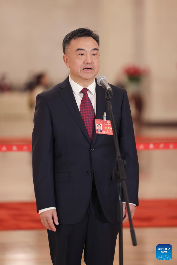 Li Qingzhong, a member of the 14th National Committee of the Chinese People's Political Consultative Conference (CPPCC), is interviewed ahead of the opening of the second session of the 14th CPPCC National Committee at the Great Hall of the People in Beijing, capital of China, March 4, 2024. (Xinhua/Xing Guangli)