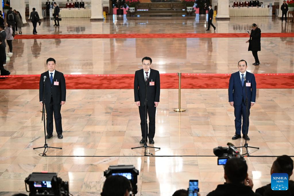 Members of the 14th National Committee of the Chinese People's Political Consultative Conference (CPPCC) are interviewed ahead of the opening of the second session of the 14th CPPCC National Committee at the Great Hall of the People in Beijing, capital of China, March 4, 2024. (Xinhua/Wang Jianhua)