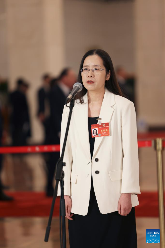 Wu Beili, a member of the 14th National Committee of the Chinese People's Political Consultative Conference (CPPCC), is interviewed ahead of the opening of the second session of the 14th CPPCC National Committee at the Great Hall of the People in Beijing, capital of China, March 4, 2024. (Xinhua/Xing Guangli)