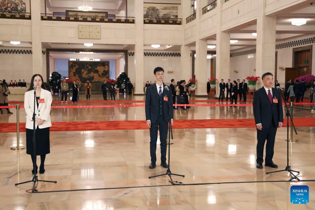 Members of the 14th National Committee of the Chinese People's Political Consultative Conference (CPPCC) are interviewed ahead of the opening of the second session of the 14th CPPCC National Committee at the Great Hall of the People in Beijing, capital of China, March 4, 2024. (Xinhua/Li He)