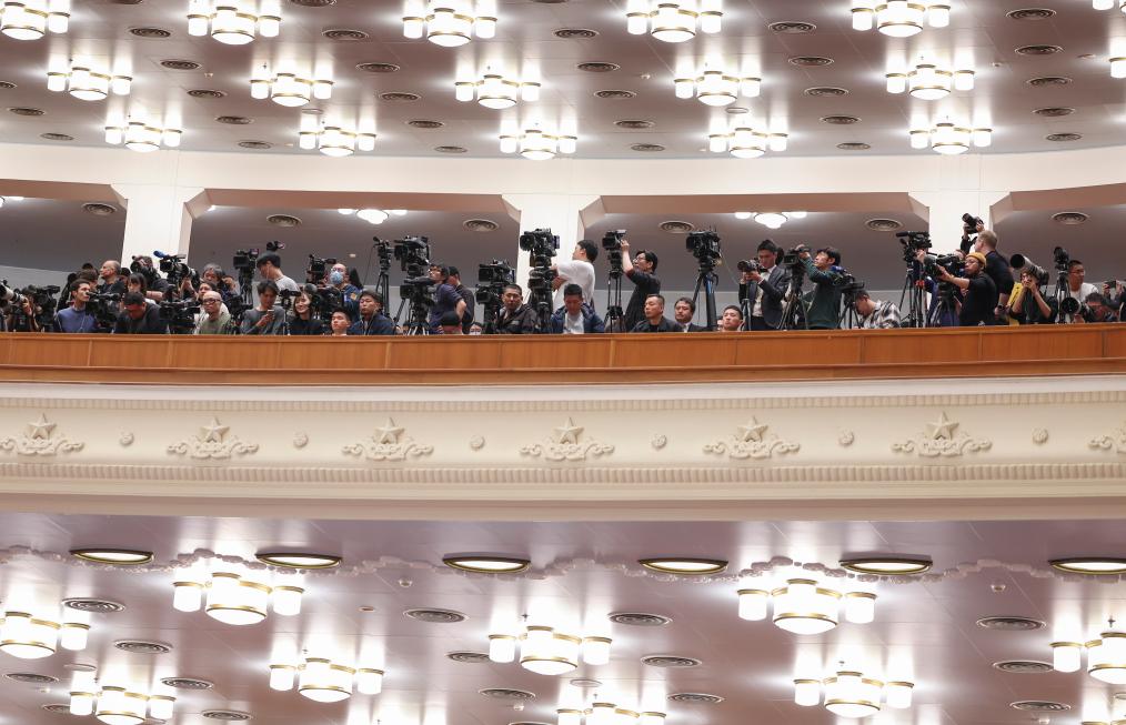 Journalists work at the opening meeting of the second session of the 14th National Committee of the Chinese People's Political Consultative Conference (CPPCC) at the Great Hall of the People in Beijing, capital of China, March 4, 2024. (Xinhua/Jin Liwang)