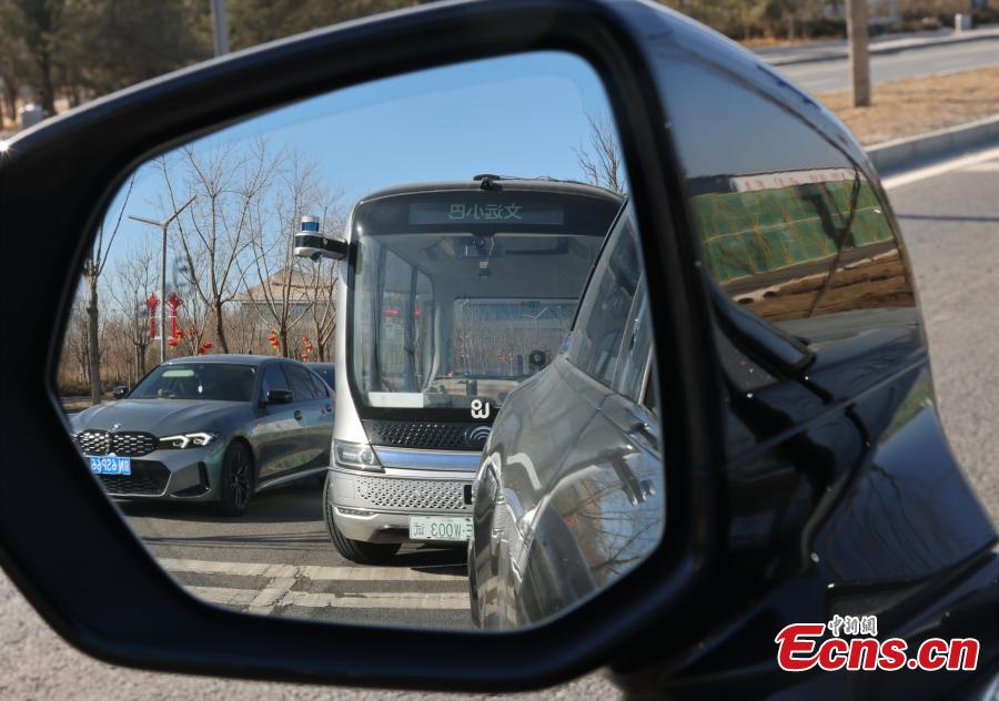 An autonomous driving bus runs on a street in Tongzhou district, Beijing's sub-center, March 3, 2024. (Photo: China News Service/Yang Kejia)