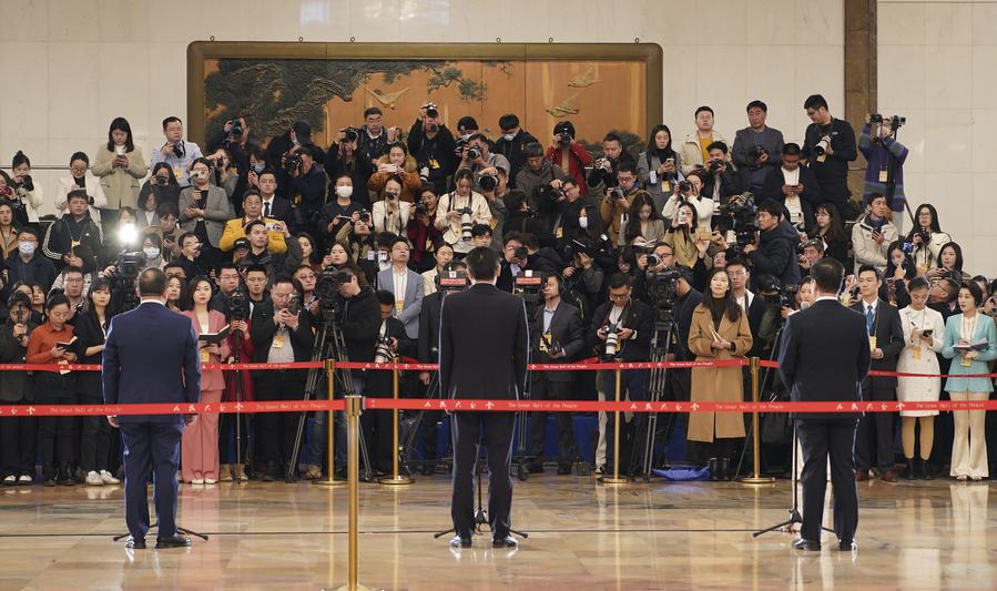 Members of the 14th National Committee of the Chinese People's Political Consultative Conference (CPPCC) are interviewed ahead of the opening of the second session of the 14th CPPCC National Committee at the Great Hall of the People in Beijing, capital of China, March 4, 2024. (Xinhua/Wang Jianhua)
