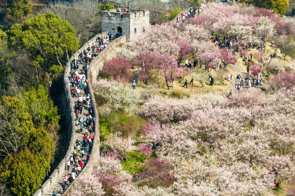 An aerial drone photo shows tourists visiting a scenic area of Linhai City, east China's Zhejiang Province, Feb. 11, 2024. (Photo by Pan Kanjun/Xinhua)