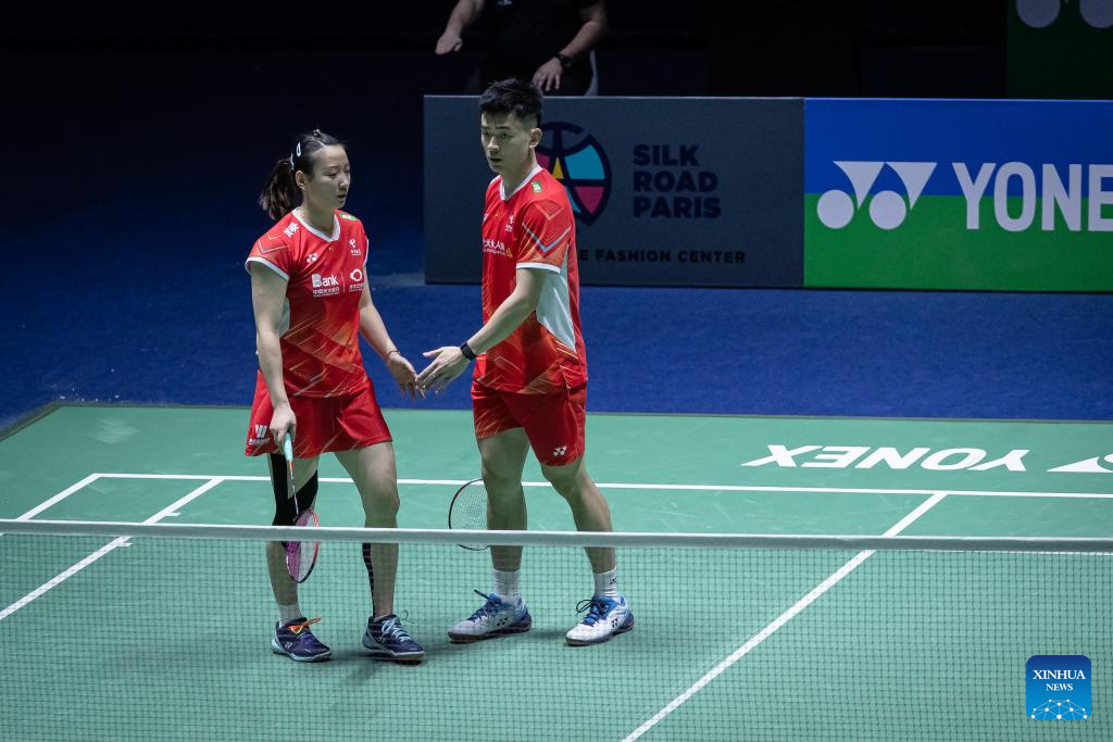 Zheng Siwei (R)/Huang Yaqiong react during the mixed doubles first round match between Zheng Siwei/Huang Yaqiong of China and Ty Alexander Linderman/Josephine Wu of Canada at the French Open badminton tournament in Paris, France, March 5, 2024. (Photo by Aurelien Morissard/Xinhua)