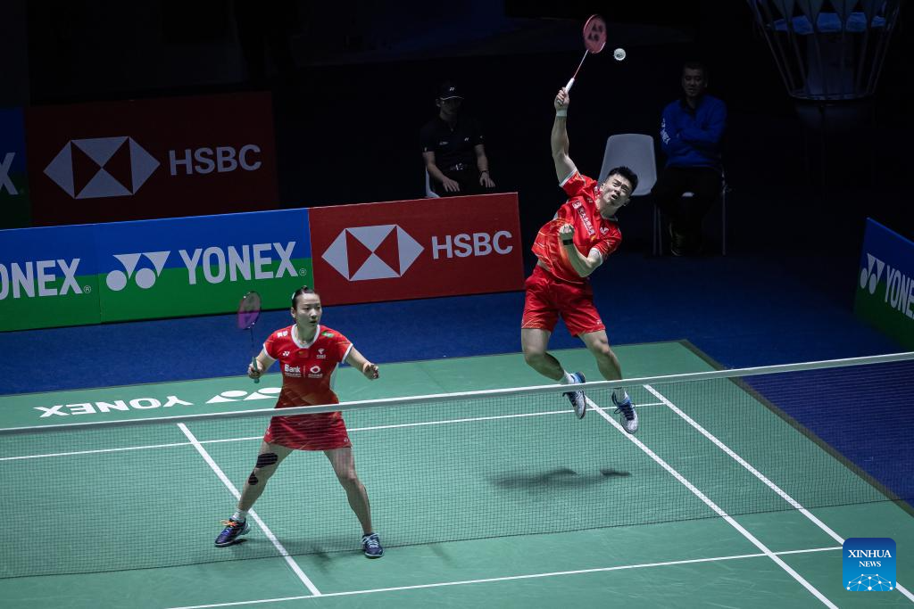 Zheng Siwei (3rd R)/Huang Yaqiong (2nd R) compete during the mixed doubles first round match between Zheng Siwei/Huang Yaqiong of China and Ty Alexander Linderman/Josephine Wu of Canada at the French Open badminton tournament in Paris, France, March 5, 2024. (Photo by Aurelien Morissard/Xinhua)