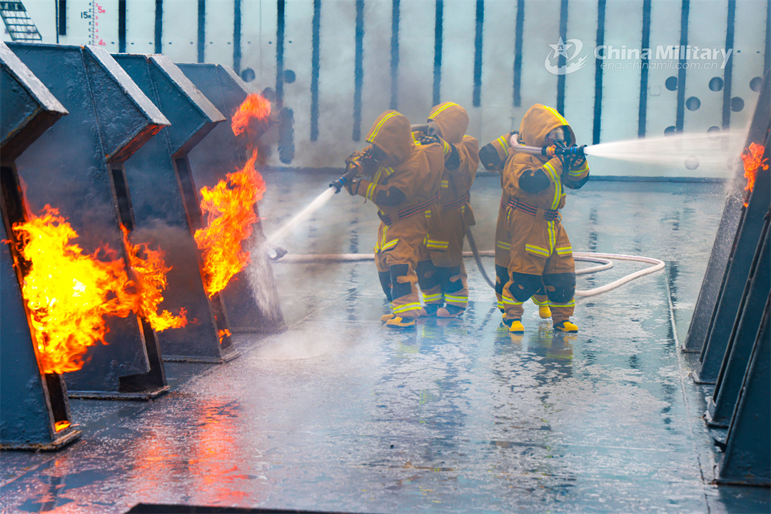 Sailors assigned to a naval flotilla under the PLA Southern Theater Command conduct damage control training during a recent training exercise. (eng.chinamil.com.cn/Photo by Li Junlin)