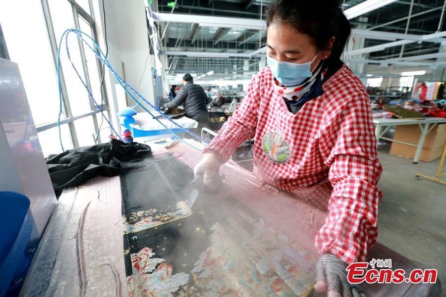 Workers iron the horse-face skirts at a garment factory in Caoxian County, east China's Shandong Province, March 4, 2024. (Photo: China News Service/Liang Ben)
