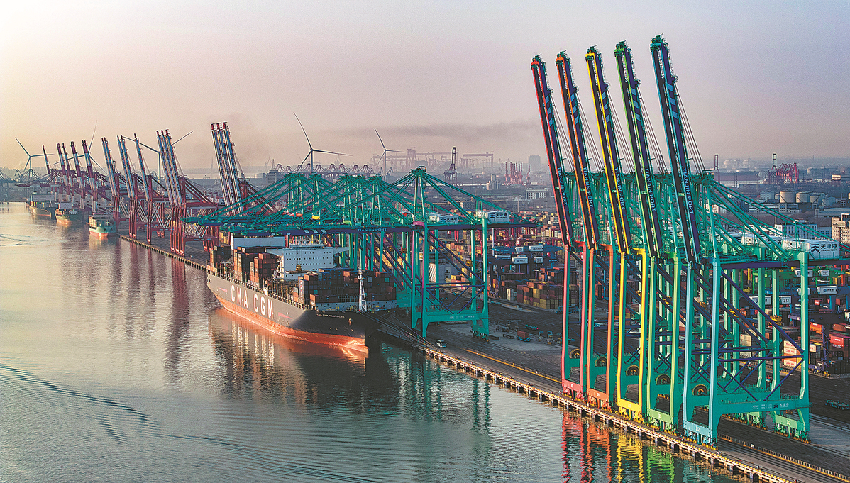 A tanker docks at a smart, zero-carbon pier in Tianjin Port last month. The pier uses artificial intelligence and autonomous vehicles to increase the efficiency of loading and unloading containers. ZHAO ZISHUO/XINHUA