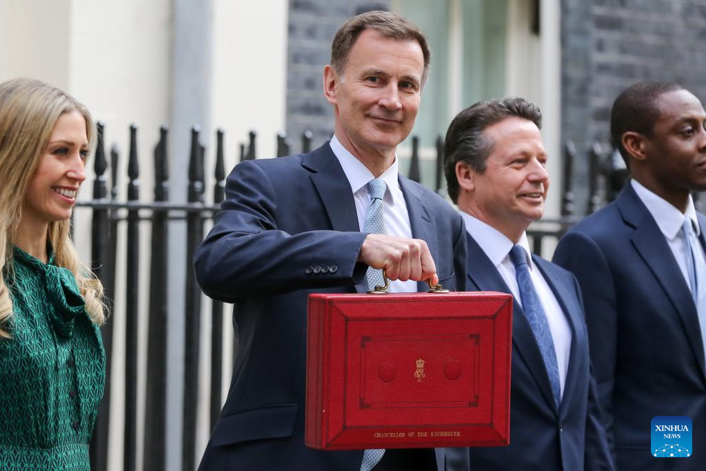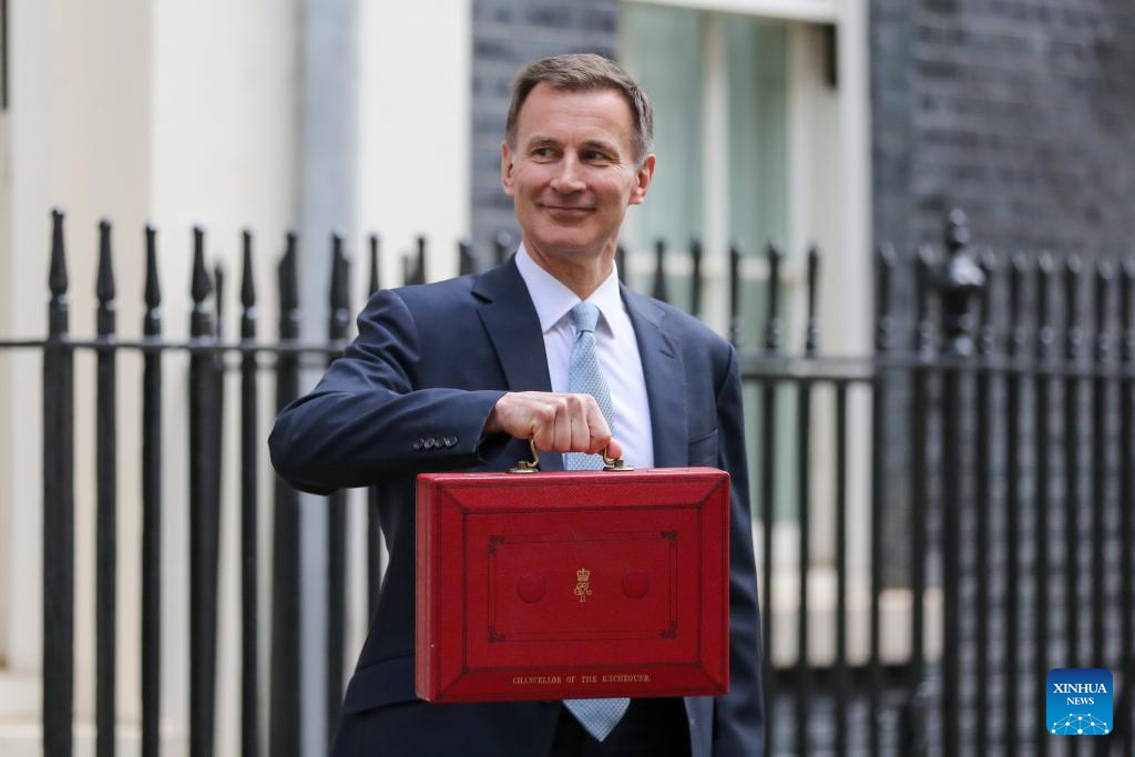 The United Kingdom's (UK) Chancellor of the Exchequer Jeremy Hunt poses for photographs as he leaves 11 Downing Street to deliver his budget to Parliament in London, Britain, on March 6, 2024. The United Kingdom's (UK) Chancellor of the Exchequer Jeremy Hunt on Wednesday announced in his spring budget that National Insurance contributions would be cut for 27 million British workers. (Xinhua)