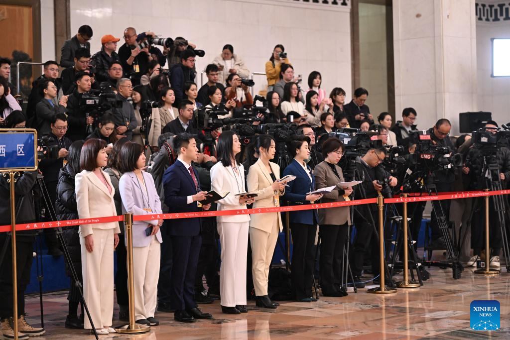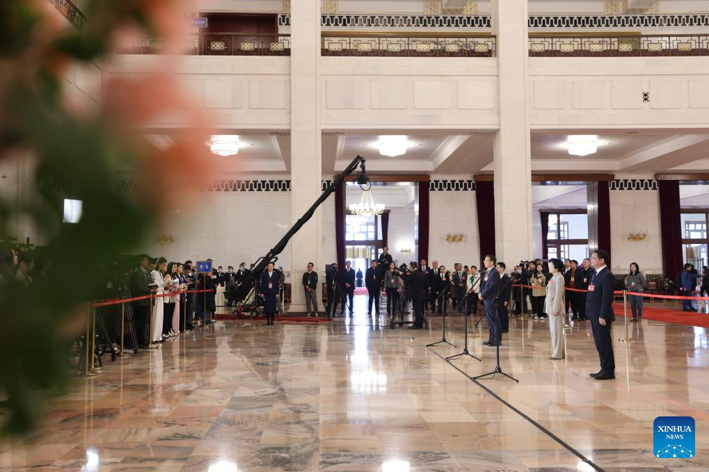 Members of the 14th National Committee of the Chinese People's Political Consultative Conference (CPPCC) are interviewed ahead of the second plenary meeting of the second session of the 14th CPPCC National Committee at the Great Hall of the People in Beijing, capital of China, March 7, 2024. (Xinhua/Xing Guangli)