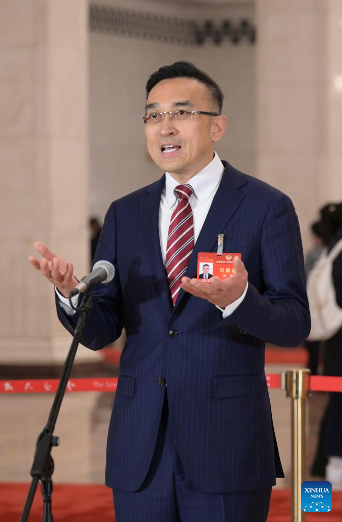 Tang Xudong, a member of the 14th National Committee of the Chinese People's Political Consultative Conference (CPPCC), is interviewed ahead of the second plenary meeting of the second session of the 14th CPPCC National Committee at the Great Hall of the People in Beijing, capital of China, March 7, 2024. (Xinhua/Li He)