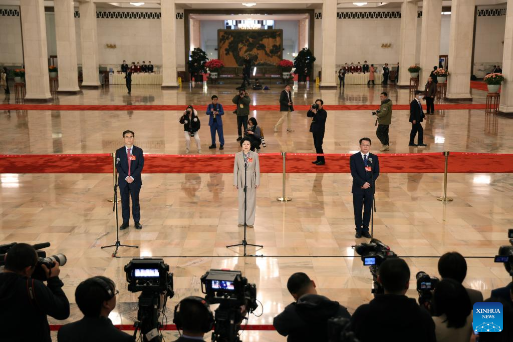 Members of the 14th National Committee of the Chinese People's Political Consultative Conference (CPPCC) are interviewed ahead of the second plenary meeting of the second session of the 14th CPPCC National Committee at the Great Hall of the People in Beijing, capital of China, March 7, 2024. (Xinhua/Jin Liwang)