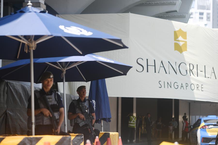 Policemen stand guard near the venue of the 20th Shangri-La Dialogue at Singapore's Shangri-La Hotel on June 2, 2023. (Photo by Then Chih Wey/Xinhua)