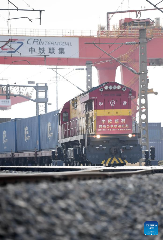A China-Europe freight train departs from Xi'an international port station in Xi'an, northwest China's Shaanxi Province, March 7, 2024. Since the beginning of 2024, more than 700 trains have been handled under the China-Europe freight train (Xi'an) service. (Xinhua/Li Yibo)