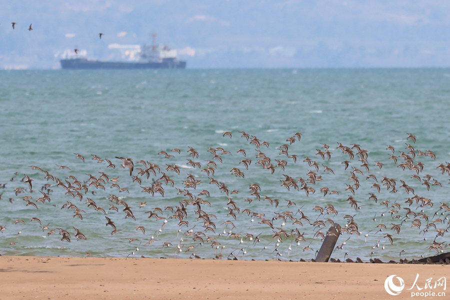 Flocks of birds hover above the sandbars located offshore in Xiamen city, southeast China's Fujian Province. (People's Daily Online/Chen Bo)