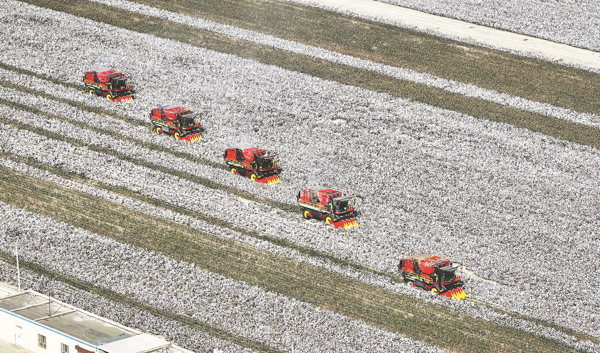 Farmers operate large cotton pickers to harvest cotton at a farm in Korla, Xinjiang Uygur autonomous region, in October. LI XIANG/XINHUA