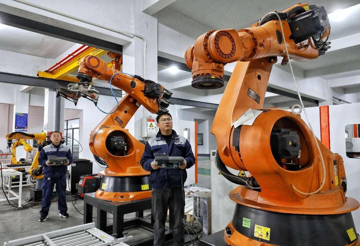 Technicians debug robots in a workshop of a robot manufacturer in Fenghuang township, Zhangjiagang, east China's Jiangsu province. (People's Daily Online/Shi Bairong)