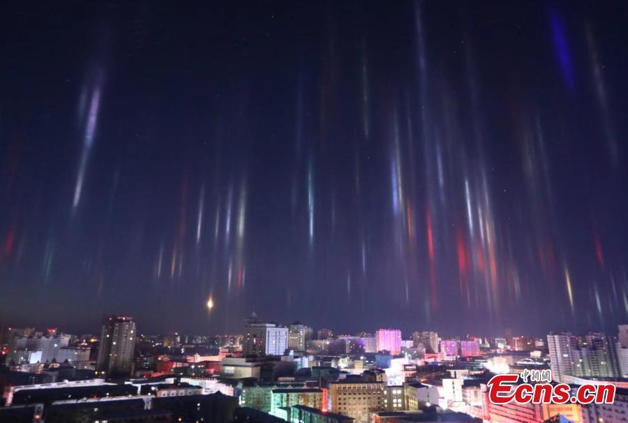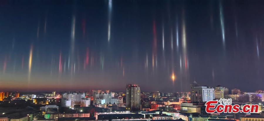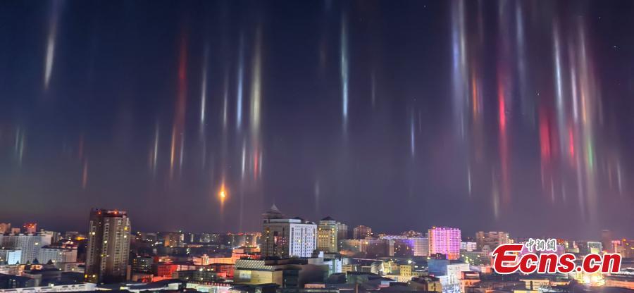 Natural light beams illuminate the night sky in Hulunbuir City, north China's Inner Mongolia Autonomous Region on March 6 morning. Known as “light pillars”, they are a rare optical illusion caused by falling ice crystals that reflect sources of light on the ground. (Photo: China News Service/Wang Ying)