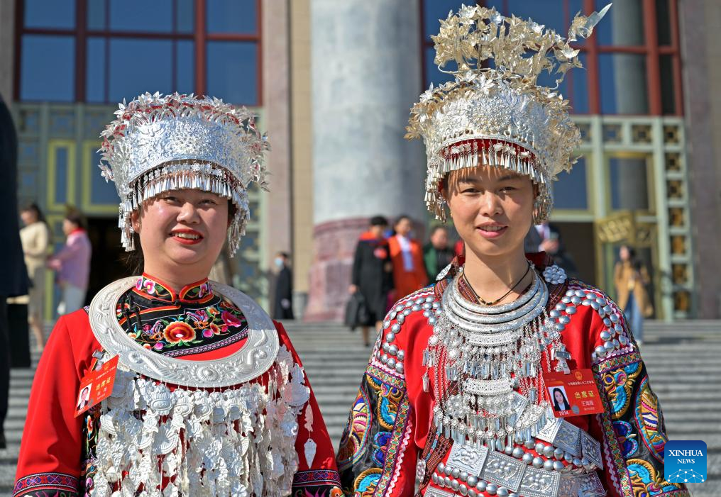 Deputies to the 14th National People's Congress (NPC) pose for photos before attending the second plenary meeting of the second session of the 14th NPC in Beijing, capital of China, March 8, 2024. (Xinhua/Cai Yang)