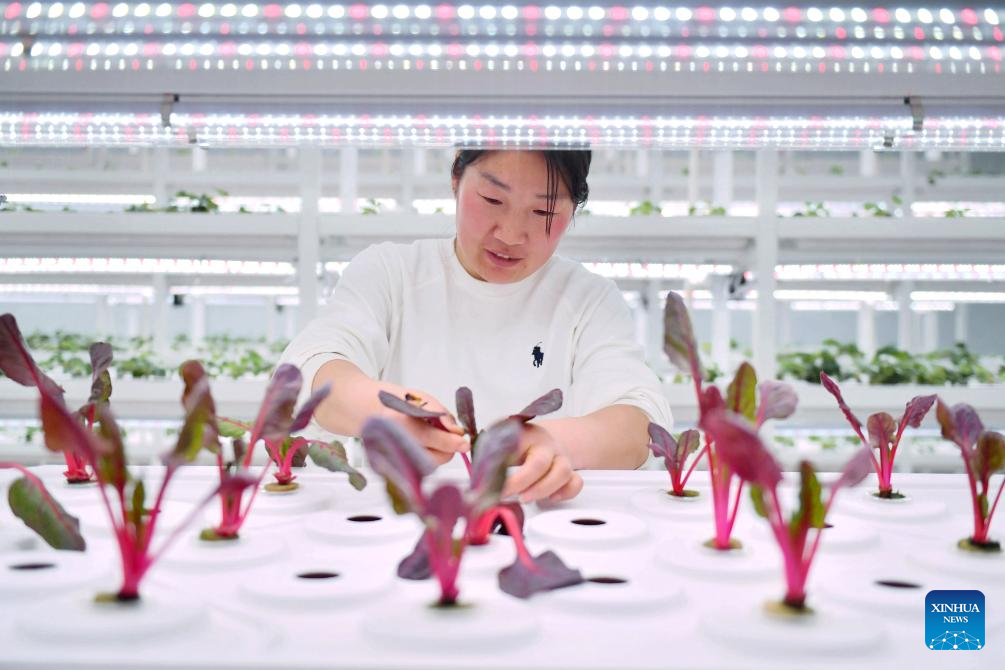 A worker checks the growth of hydroponic vegetables at a modern agriculture demonstration park in Guantao County, north China's Hebei Province, March 8, 2024. In recent years, Guantao County has applied smart technologies to agricultural production, giving impetus to the modernization of agriculture. (Xinhua/Wang Xiao)