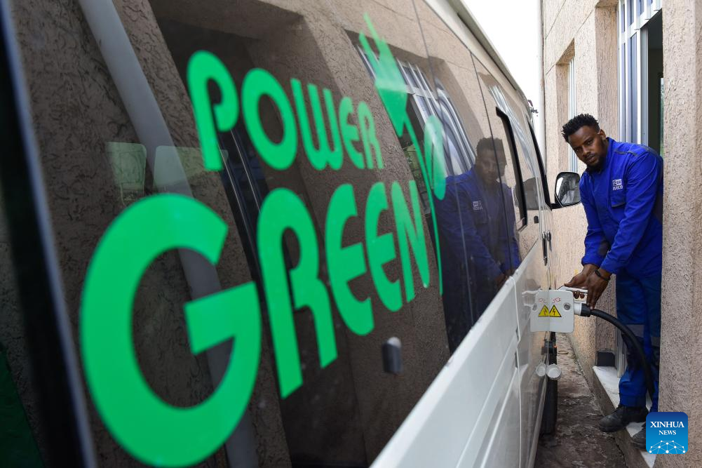 A worker charges an electric minibus at a factory in Addis Ababa, capital of Ethiopia, March 6, 2024. (Xinhua/Michael Tewelde)