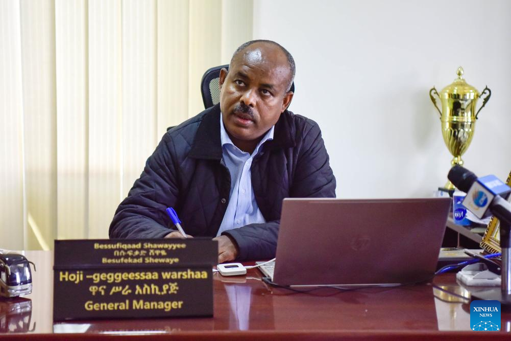 Besufekad Shewaye, the general manager of Belayneh Kindie Metal Engineering Complex, is pictured during an interview with Xinhua in Addis Ababa, capital of Ethiopia, March 6, 2024. (Xinhua/Michael Tewelde)