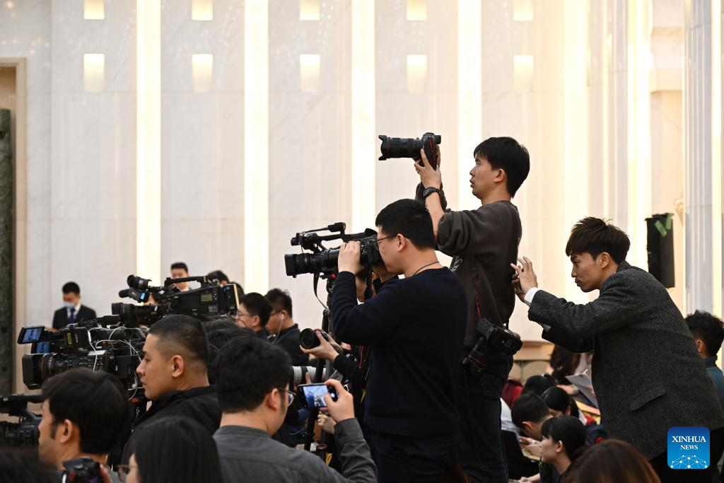 Journalists work at a group meeting of deputies from the Taiwan delegation at the second session of the 14th National People's Congress (NPC) in Beijing, capital of China, March 9, 2024. (Xinhua/Li Xin)