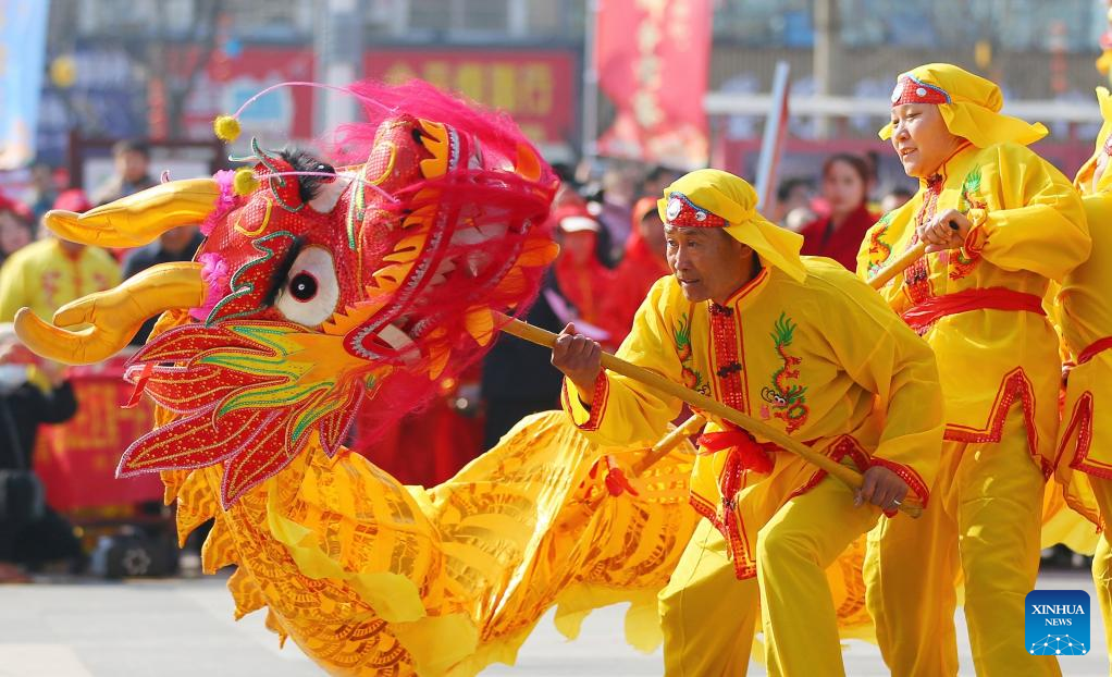 Folk artists give a dragon dance performance in Zaozhuang City, east China's Shandong Province, March 9, 2024.