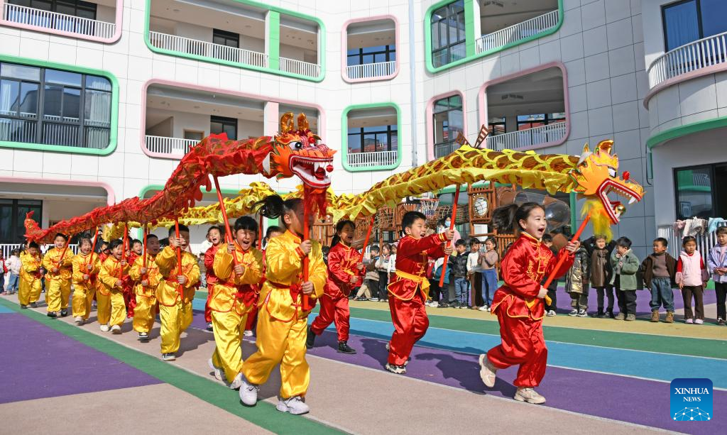 Children give a dragon dance performance at Yinghui kindergarten in Xianju County in Taizhou City, east China's Zhejiang Province, March 8, 2024.