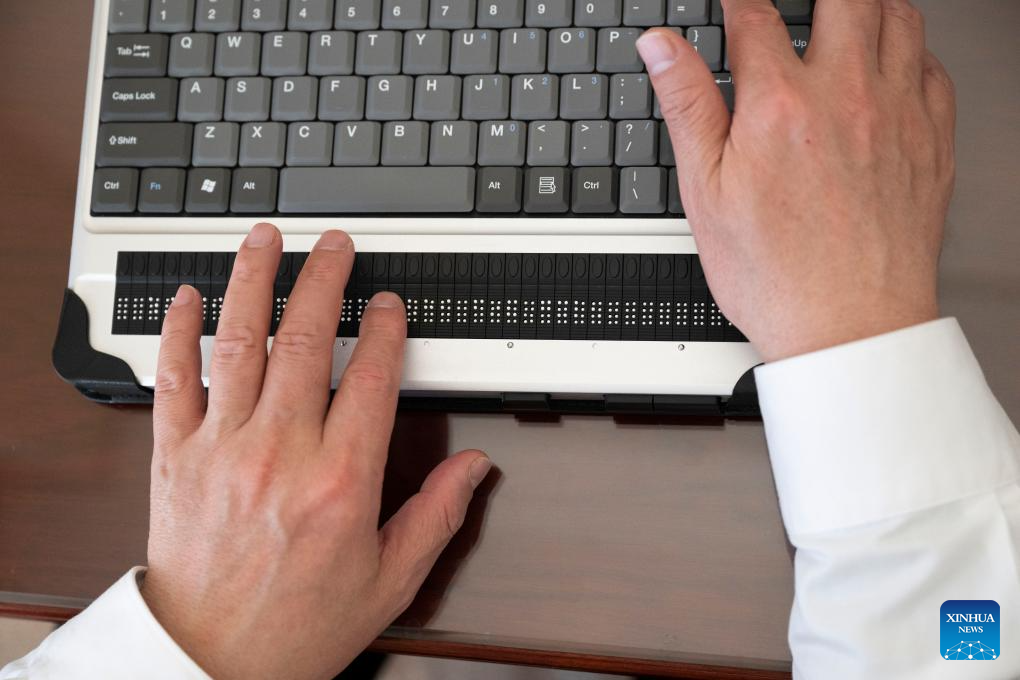 Wang Yongcheng, a deputy to the 14th National People's Congress (NPC), uses his laptop adapted for visually impaired people at the base of Fujian delegation, in Beijing, capital of China, March 3, 2024. (Xinhua/Cai Yang)
