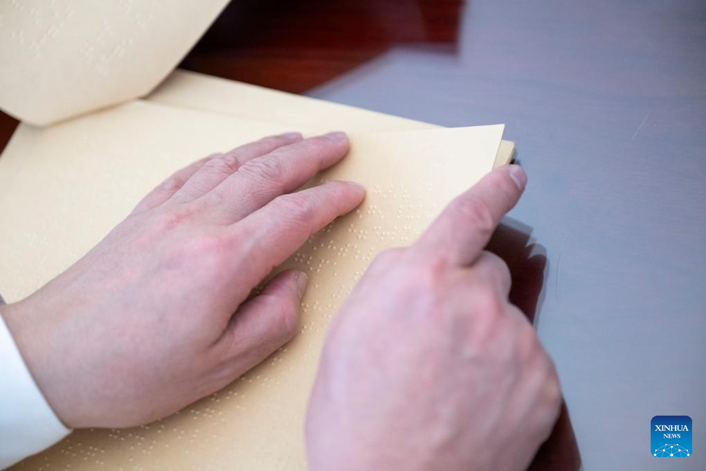 Wang Yongcheng, a deputy to the 14th National People's Congress (NPC), shows his suggestions written in Braille at the base of Fujian delegation, in Beijing, capital of China, March 3, 2024. (Xinhua/Cai Yang)