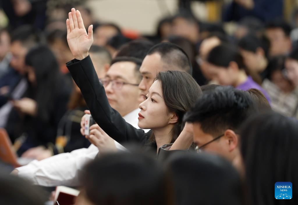 A journalist raises her hand to ask questions at a press conference on people's livelihood for the second session of the 14th National People's Congress (NPC) in Beijing, capital of China, March 9, 2024. China's Minister of Education Huai Jinpeng, Minister of Human Resources and Social Security Wang Xiaoping, Minister of Housing and Urban-Rural Development Ni Hong, and Chief of the National Disease Control and Prevention Administration Wang Hesheng attended the press conference on Saturday. (Xinhua/Fei Maohua)