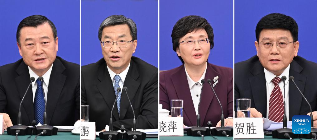 This combo photo shows China's Minister of Education Huai Jinpeng (2nd L), Minister of Human Resources and Social Security Wang Xiaoping (2nd R), Minister of Housing and Urban-Rural Development Ni Hong (1st L), and Chief of the National Disease Control and Prevention Administration Wang Hesheng (1st R) attending a press conference on people's livelihood for the second session of the 14th National People's Congress (NPC) in Beijing, capital of China, March 9, 2024. (Xinhua/Mu Yu)