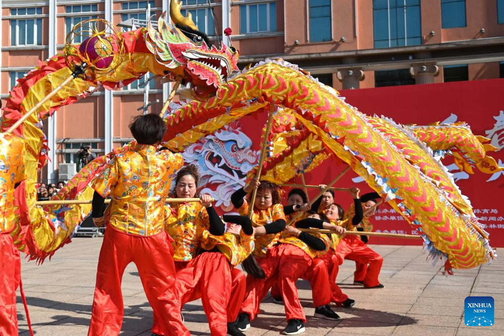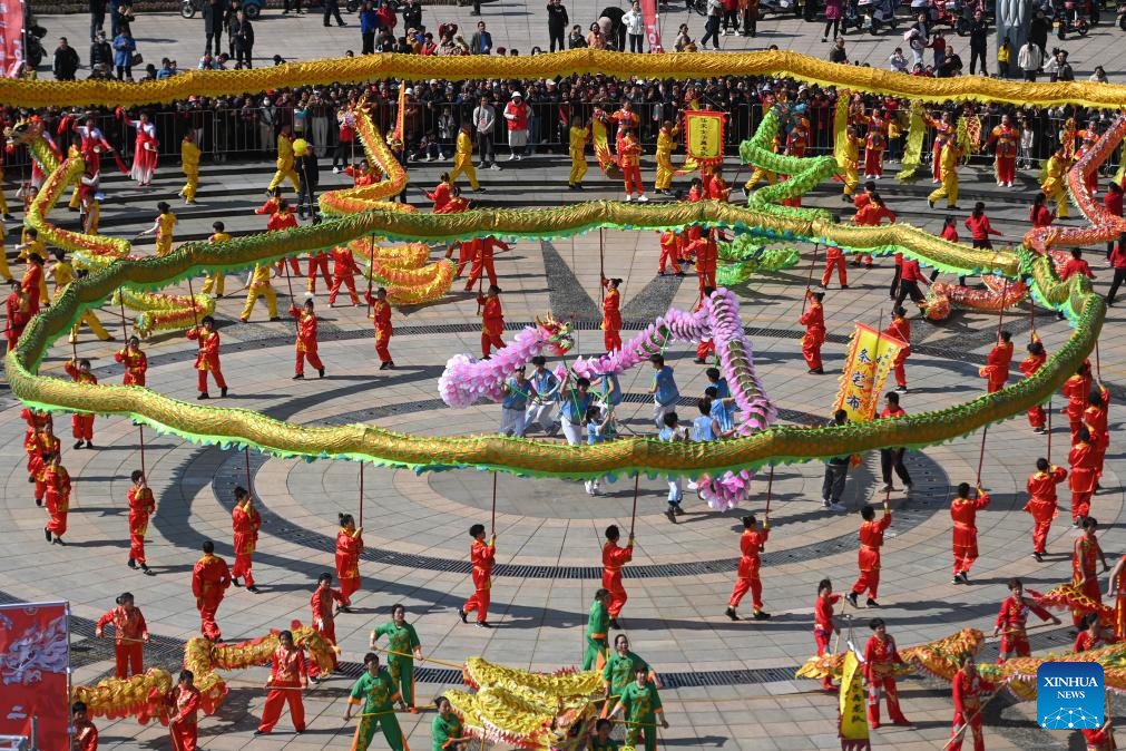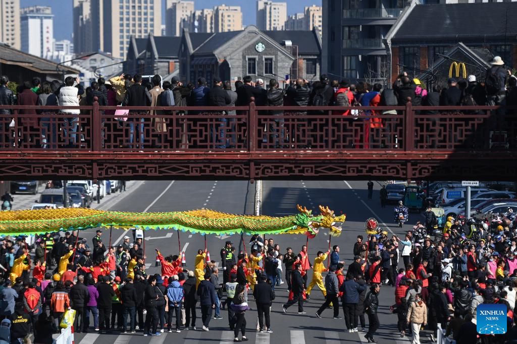 Folk artists perform dragon dance in celebration of the upcoming Longtaitou Day in Fenghua, east China's Zhejiang Province, March 10, 2024. (Xinhua/Huang Zongzhi)