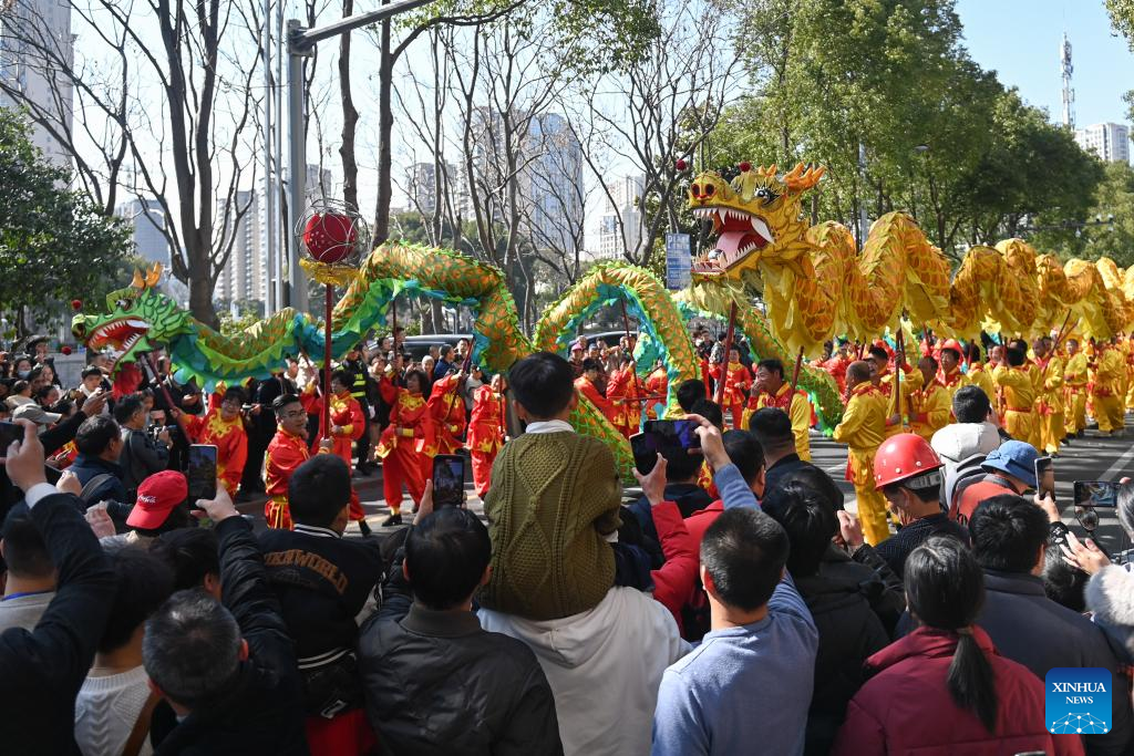 Folk artists holding cloth dragons take part in a parade in celebration of the upcoming Longtaitou Day in Fenghua, east China's Zhejiang Province, March 10, 2024. (Xinhua/Huang Zongzhi)